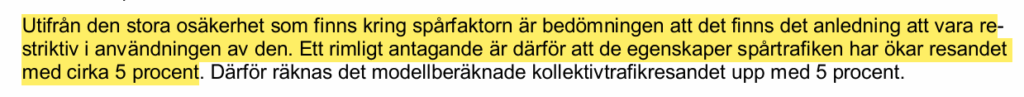 Samtidigt så finns inga bra vetenskapliga data på att, vad kommunen beskriver som ”spårvägseffekten”, ens existerar. De resonerar på sida 38: ”…det är emellertid svårt att påvisa eller avvisa förekomsten av spårfaktorn.” Men väljer att räkna försiktigt med 5%